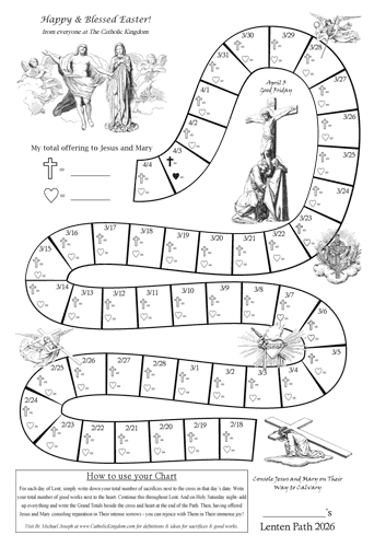 The purpose of the Lenten Path is to help you in your Lenten resolutions. Whatever it is that you may be giving up or doing as a mortification during this holy season – this calendar will help you keep track of your progress and perseverance. 40 days is quite a bit of time and it is easy to get side tracked and lose sight of your goal. And so your Lenten Path is to assist you in charting your sacrifices and good works – so that, staying focused, you will reach the goal you set out to achieve.